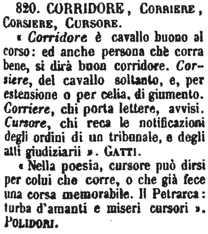 Corridore, Corriere, Corsiere, Cursore - « Corridore è cavallo buono al corso: ed anche persona che corra bene, si dirà buon corridore. Corsiere, del cavallo soltanto, e, per estensione o per celia, di giumento. Corriere, chi porta lettere, avvisi. Cursore, chi reca le notificazioni degli ordini di un tribunale, e degli atti giudiziarii ». Gatti.