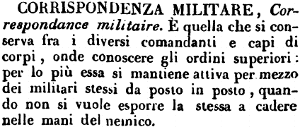 | Corrispondenza militare - Correspondance militaire. È quella che si conserva fra i diversi comandanti e capi di corpi, onde conoscere gli ordini superiori: per lo più essa si mantiene attiva per mezzo dei militari stessi da posto in posto, quando non si vuole esporre la stessa a cadere nelle mani del nemico. [immagine] |