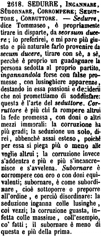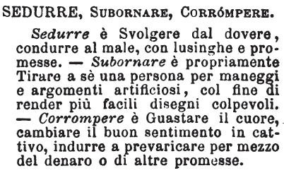 | Sedurre, Subornare, Corrompere - Sedurre è Svolgere dal dovere, condurre al male, con lusinghe e promesse. - Subornare è propriamente Tirare a sè una persona per maneggi e argomenti artificiosi, col fine di render più facili disegni colpevoli. - Corrompere è Guastare il cuore, cambiare il buon sentimento in cattivo, indurre a prevaricare per mezzo del denaro o di altre promesse. [immagine] |