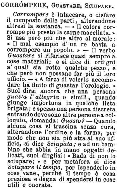 | Corrompere, Guastare, Sciupare - Corrompere è Intaccare, o disfare il composto delle parti, alterandone altresì la sostanza. - «Il calore corrompe più presto la carne macellata.» Si usa però più che altro al morale: «Il mal esempio d'un re basta a corrompere un popolo.» - Il verbo Guastare si riferisce quasi sempre a cose materiali; e si dice di ordigni a' quali sia rotto qualche pezzo, e che però non possano far più il loro ufficio. - «A forza di volerlo accomodare ha finito di guastar l'orologio.» Suol dirsi ancora che una persona guasta l'allegria o simili, quando giunge importuna in qualche lieta brigata; e spesso una persona discreta entrando dove sono altre persone a colloquio, domanda: Guasto? - Quando alcuna cosa si trascina senza cura, alterandone l'ordine e la forma, per modo che non sia più atta al suo ufficio, si dice Sciupata; e ad un bambino che abbia in mano oggetti delicati, suol dirglisi: «Bada di non lo sciupare;» e per metafora si dice Sciupare il tempo, per Ispenderlo in cose vane, perchè il tempo è cosa preziosa e degna di spendersi in cose utili e onorate. [immagine] |