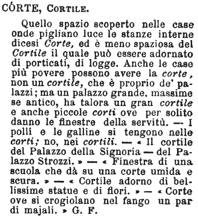 | Corte, Cortile - Quello spazio scoperto nelle case onde pigliano luce le stanze interne dicesi Corte, ed è meno spaziosa del Cortile il quale può essere adornato di porticati, di logge. Anche le case più povere possono avere la corte, non un cortile, che è proprio de' palazzi; ma un palazzo grande, massime se antico, ha talora un gran cortile e anche piccole corti ove per solito danno le finestre della servitù. - I polli e le galline si tengono nelle corti; no, nei cortili. - «Il cortile del Palazzo della Signoria - del Palazzo Strozzi.» - «Finestra di una scuola che dà su una corte umida e scura.» - «Cortile adorno di bellissime statue e di fiori.» - «Corte ove si crogiolano nel fango un par di majali.» G. F. [immagine] |