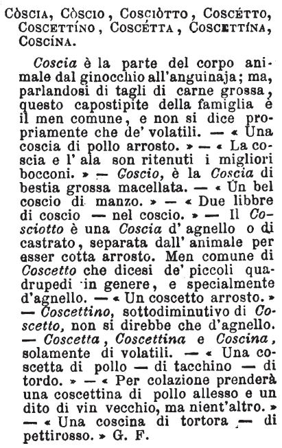 | Coscia, Coscio, Cosciotto, Coscetto, Coscettino, Coscetta, Coscettina, Coscina - Coscia è la parte del corpo animale dal ginocchio all'anguinaja; ma, parlandosi di tagli di carne grossa, questo capostipite della famiglia è il men comune, e non si dice propriamente che de' volatili. - «Una coscia di pollo arrosto.» - «La coscia e l'ala son ritenuti i migliori bocconi.» - Coscio, è la Coscia di bestia grossa macellata. - «Un bel coscio di manzo.» - «Due libbre di coscio - nel coscio.» - Il Cosciotto è una Coscia d'agnello o di castrato, separata dall'animale per esser cotta arrosto. Men comune di Coscetto che dicesi de' piccoli quadrupedi in genere, e specialmente d'agnello. - «Un coscetto arrosto.» - Coscettino, sottodiminutivo di Coscetto, non si direbbe che d'agnello. - Coscetta, Coscettina e Coscina, solamente di volatili. - «Una coscetta di pollo - di tacchino - di tordo.» - «Per colazione prenderà una coscettina di pollo allesso e un dito di vin vecchio, ma nent'altro.» - «Una coscina di tortora - di pettirosso.» G. F. [immagine] |