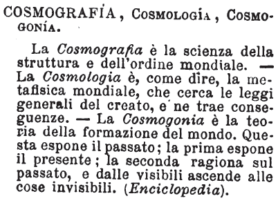 | Cosmologia - Scienza che tratta delle leggi generali da cui è governato l'universo. La cosmologia degli antichi si riduceva a poche e vaghe opinioni ed a cognizioni geografiche imperfette e superficiali. [immagine] |