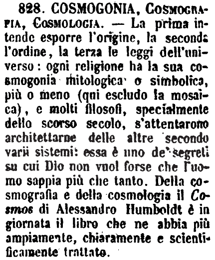 | Cosmogonia, Cosmografia, Cosmologia - La prima intende esporre l'origine, la seconda l'ordine, la terza le leggi dell'universo: ogni religione ha la sua cosmogonia mitologica o simbolica, più o meno (qui escludo la mosaica), e molti filosofi, specialmente dello scorso secolo, s'attentarono architettarne delle altre secondo varii sistemi: essa è uno de' segreti su cui Dio non vuol forse che l'uomo sappia più che tanto. Della cosmografia e della cosmologia il Cosmos di Alessandro Humboldt è in giornata il libro che ne abbia più ampiamente, chiaramente e scientificamente trattato. [immagine] |