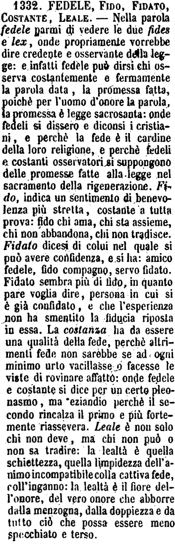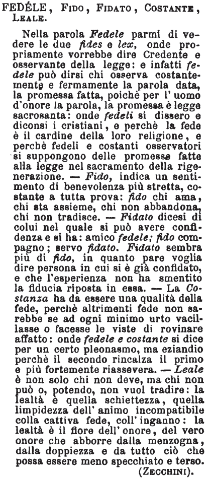 | Fedele, Fido, Fidato, Costante, Leale - Nella parola fedele parmi di vedere le due fides e lex, onde propriamente vorrebbe dire credente e osservante della legge: e infatti fedele può dirsi chi osserva costantemente e fermamente la parola data, la promessa fatta, poichè per l'uomo d'onore la parola, la promessa è legge sacrosanta: onde fedeli si dissero e diconsi i cristiani, e perchè la fede è il cardine della loro religione, e perchè fedeli e costanti osservatori si suppongono delle promesse fatte alla legge nel sacramento della rigenerazione. Fido, indica un sentimento di benevolenza più stretta, costante a tutta prova: fido chi ama, chi sta assieme, chi non abbandona, chi non tradisce. Fidato dicesi di colui nel quale si può avere confidenza, e si ha: amico fedele, fido compagno, servo fidato. Fidato sembra più di fido, in quanto pare voglia dire, persona in cui si è già confidato, e che l'esperienza non ha smentito la fiducia riposta in essa. La costanza ha da essere una qualità della fede, perchè altrimenti fede non sarebbe se ad ogni minimo urto vacillasse o facesse le viste di rovinare affatto: onde fedele e costante si dice per un certo pleonasmo, ma eziandio perchè il secondo rincalza il primo e più fortemente riassevera. Leale è non solo chi non deve, ma chi non può o non sa tradire: la lealtà è quella schiettezza, quella limpidezza dell'animo incompatibile colla cattiva fede, coll'inganno: la lealtà è il fiore dell'onore, del vero onore che abborre dalla menzogna, dalla doppiezza e da tutto ciò che possa essere meno specchiato e terso. [immagine] |