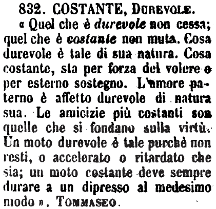 | Costante, Durevole - «Quel che è durevole non cessa; quel che è costante non muta. Cosa durevole è tale di sua natura. Cosa costante, sta per forza del volere e per esterno sostegno. L'amore paterno è affetto durevole di natura sua. Le amicizie più costanti son quelle che si fondano sulla virtù. Un moto durevole è tale purchè non resti, o accelerato o ritardato che sia; un moto costante deve sempre durare a un dipresso al medesimo modo». Tommaseo. [immagine] |