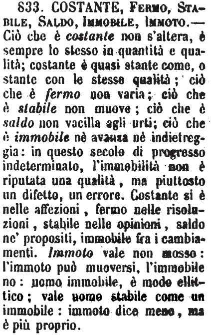 | Costante, Fermo, Stabile, Saldo, Immobile, Immoto - Ciò che è costante non s'altera, è sempre lo stesso in quantità e qualità; costante è quasi stante come, o stante con le stesse qualità; ciò che è fermo non varia; ciò che è stabile non muove; ciò che è saldo non vacilla agli urti; ciò che è immobile nè avanza nè indietreggia: in questo secolo di progresso indeterminato, l'immobilità non è riputata una qualità, ma piuttosto un difetto, un errore. Costante si è nelle affezioni, fermo nelle risoluzioni, stabile nelle opinioni, saldo ne' propositi, immobile fra i cambiamenti. Immoto vale non mosso: l'immoto può muoversi, l'immobile no: uomo immobile, è modo ellittico; vale uomo stabile come un immobile: immoto dice meno, ma è più proprio. [immagine] |