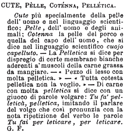 | Cute, Pelle, Cotenna, Pelletica - Cute più specialmente della pelle dell'uomo e nel linguaggio scientifico; Pelle, dell'uomo e degli animali; Cotenna la pelle del porco e quella del capo dell'uomo, che si dice nel linguaggio scientifico cuojo capelluto. - La Pelletica si dice per dispregio di certe membrane bianche aderenti a' muscoli della carne grassa da mangiare. - «Pezzo di lesso con molta pelletica.» - «Tutta cotesta pelletica non la voglio.» - Di carne con molta pelletica si dice con un giuoco di parole volgare: Tu fa' pelleticà, pelletica, imitando il parlare del volgo che così pronunzia con la nota ripetizione del verbo le parole Tu fai per leticare, per leticare. G. F. [immagine] |