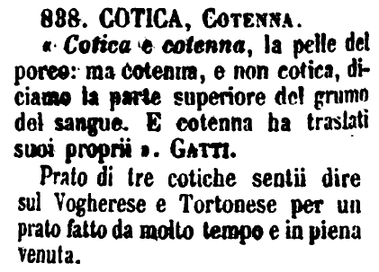| Cotica, Cotenna - «Cotica e cotenna, la pelle del porco: ma cotenna, e non cotica, diciamo la parte superiore del grumo del sangue. E cotenna ha traslati suoi proprii». Gatti.