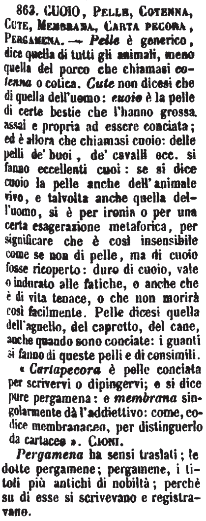 | Cuoio, Pelle, Cotenna, Cute, Membrana, Carta pecora, Pergamena - Pelle è generico, dice quella di tutti gli animali, meno quella del porco che chiamasi cotenna o cotica. Cute non dicesi che di quella dell'uomo: cuoio è la pelle di certe bestie che l'hanno grossa, assai e propria ad essere conciata; ed è allora che chiamasi cuoio: delle pelli de' buoi, de' cavalli ecc. si fanno eccellenti cuoi: se si dice cuoio la pelle anche dell'animale vivo, e talvolta anche quella dell'uomo, si è per ironia o per una certa esagerazione metaforica, per significare che è così insensibile come se non di pelle, ma di cuoio fosse ricoperto: duro di cuoio, vale o indurato alle fatiche, o anche che è di vita tenace, o che non morirà così facilmente. Pelle dicesi quella dell'agnello, del capretto, del cane, anche quando sono conciate: i guanti si fanno di queste pelli e di consimili.