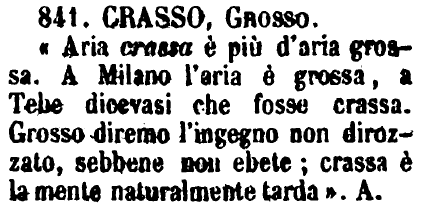 | Crasso, Grosso - «Aria crassa è più d'aria grossa. A Milano l'aria è grossa, a Tebe dicevasi che fosse crassa. Grosso diremo l'ingegno non dirozzato, sebbene non ebete; crassa è la mente naturalmente tarda». A. [immagine] |