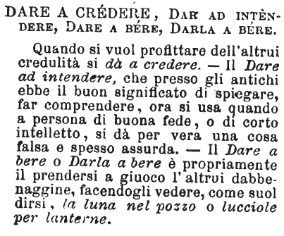 | Dare a credere, Dar ad intendere, Dare a bere, Darla a bere - Quando si vuol profittare dell'altrui credulità si dà a credere. - Il Dare ad intendere, che presso gli antichi ebbe il buon significato di spiegare, far comprendere, ora si usa quando a persona di buona fede, o di corto intelletto, si dà per vera una cosa falsa e spesso assurda. - Il Dare a bere o Darla a bere è propriamente il prendersi a giuoco l'altrui dabbenaggine, facendogli vedere, come suol dirsi, la luna nel pozzo o lucciole per lanterne. [immagine] |