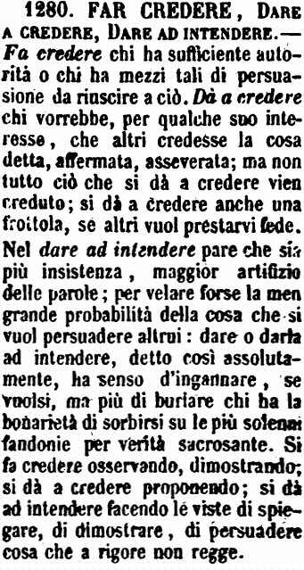 | Far credere, Dare a credere, Dare ad intendere - Fa credere chi ha sufficiente autorità o chi ha mezzi tali di persuasione da riuscire a ciò. Dà a credere chi vorrebbe, per qualche suo interesse, che altri credesse la cosa detta, affermata, asseverata; ma non tutto ciò che si dà a credere vien creduto; si dà a credere anche una frottola, se altri vuol prestarvi fede. Nel dare ad intendere pare che sia più insistenza, maggior artifizio delle parole; per velare forse la men grande probabilità della cosa che si vuol persuadere altrui: dare o darla ad intendere, detto così assolutamente, ha senso d'ingannare, se vuolsi, ma più di burlare chi ha la bonarietà di sorbirsi su le più solenni fandonie per verità sacrosante. Si fa credere osservando, dimostrando; si dà a credere proponendo; si dà ad intendere facendo le viste di spiegare, di dimostrare, di persuadere cosa che a rigore non regge. [immagine] |