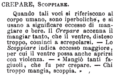 | Crepare, Scoppiare - Quando tali voci si riferiscono al corpo umano, sono iperboliche, e si usano a significare eccesso di mangiare e bere. Il Crepare accenna il mangiar tanto, che il ventre, disteso troppo, cominci a screpolarsi. - Lo Scoppiare indica eccesso maggiore, per cui il ventre possa anche aprirsi con violenza. - «Mangiò tanti fagiuoli, che fu per crepare. - Chi troppo mangia, scoppia.» [immagine] |
