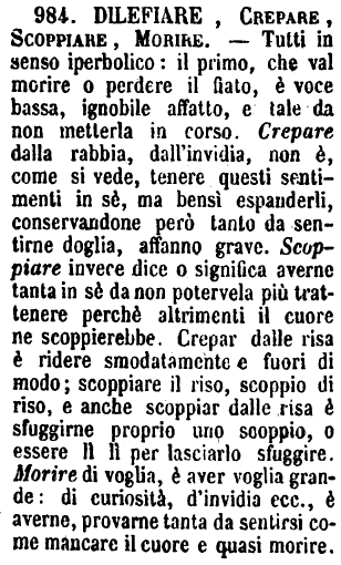 | Dilefiare, Crepare, Scoppiare, Morire - Tutti in senso iperbolico: il primo, che val morire o perdere il fiato, è voce bassa, ignobile affatto, e tale da non metterla in corso. Crepare dalla rabbia, dall'invidia, non è, come si vede, tenere questi sentimenti in sè, ma bensì espanderli, conservandone però tanto da sentirne doglia, affanno grave. Scoppiare invece dice o significa averne tanta in sè da non potervela più trattenere perchè altrimenti il cuore ne scoppierebbe. Crepar dalle risa è ridere smodatamente e fuori di modo; scoppiare il riso, scoppio di riso, e anche scoppiar dalle risa è sfuggirne proprio uno scoppio, o essere lì lì per lasciarlo sfuggire. Morire di voglia, è aver voglia grande: di curiosità, d'invidia ecc., è averne, provarne tanta da sentirsi come mancare il cuore e quasi morire. [immagine] |