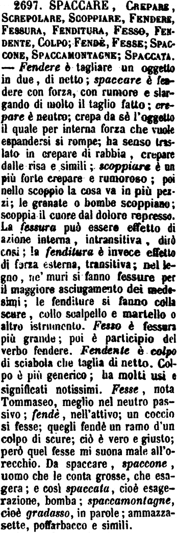 | Spaccare, Crepare, Screpolare, Scoppiare, Fendere, Fessura, Fenditura, Fesso, Fendente, Colpo; Fendè, Fesse; Spaccone, Spaccamontagne; Spaccata - Fendere è tagliare un oggetto in due, di netto; spaccare è fendere con forza, con rumore e slargando di molto il taglio fatto; crepare è neutro; crepa da sè l'oggetto il quale per interna forza che vuole espandersi si rompe; ha senso traslato in crepare di rabbia, crepare dalle risa e simili; scoppiare è un più forte crepare e rumoroso; poi nello scoppio la cosa va in più pezzi; le granate o bombe scoppiano; scoppia il cuore dal dolore represso. La fessura può essere effetto di azione interna, intransitiva, dirò così; la fenditura è invece effetto di forza esterna, transitiva; nel legno, ne' muri si fanno fessure per il maggiore asciugamento dei medesimi; le fenditure si fanno colla scure, collo scalpello e martello o altro istrumento. Fesso è fessura più grande; poi è participio del verbo fendere. Fendente è colpo di sciabola che taglia di netto. Colpo è più generico; ha molti usi e significati notissimi. Fesse, nota Tommaseo, meglio nel neutro passivo; fendè, nell'attivo; un coccio si fesse; quegli fendè un ramo d'un colpo di scure; ciò è vero e giusto; però quel fesse mi suona male all'orecchio. Da spaccare, spaccone, uomo che le conta grosse, che esagera; e così spaccata, cioè esagerazione, bomba; spaccamontagne, cioè gradasso, in parole; ammazzasette, poffarbacco e simili. [immagine] |