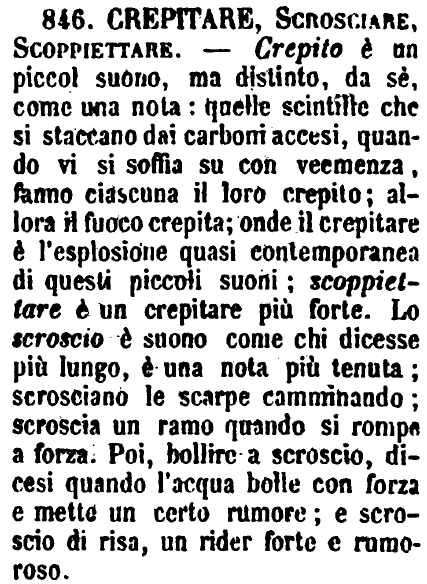 | Crepitare, Scrosciare, Scoppiettare - Crepito è un piccol suono, ma distinto, da sé, come una nota: quelle scintille che si staccano dai carboni accesi, quando vi si soffia su con veemenza, fanno ciascuna il loro crepito; allora il fuoco crepita; onde il crepitare è l'esplosione quasi contemporanea di questi piccoli suoni; scoppiettare è un crepitare più forte. Lo scroscio è suono come chi dicesse più lungo, è una nota più tenuta; scrosciano le scarpe camminando; scroscia un ramo quando si rompe a forza. Poi, bollire a scroscio, dicesi quando l'acqua bolle con forza e mette un certo rumore; e scroscio di risa, un rider forte e rumoroso. [immagine] |