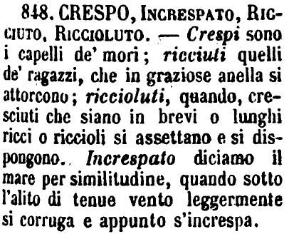 | Crespo, Increspato, Ricciuto, Riccioluto - Crespi sono i capelli de' mori; ricciuti quelli de' ragazzi, che in graziose anella si attorcono; riccioluti, quando, cresciuti che siano in brevi o lunghi ricci o riccioli si assettano e si dispongono. Increspato diciamo il mare per similitudine, quando sotto l'alito di tenue vento leggermente si corruga e appunto s'increspa. [immagine] |