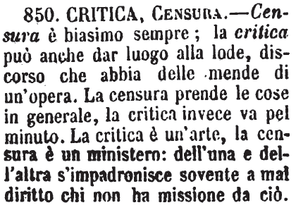 | Critica, Censura - Censura è biasimo sempre; la critica può anche dar luogo alla lode, discorso che abbia delle mende di un'opera. La censura prende le cose in generale, la critica invece va pel minuto. La critica è un'arte, la censura è un ministero: dell'una e dell'altra s'impadronisce sovente a mal diritto chi non ha missione da ciò. [immagine] |