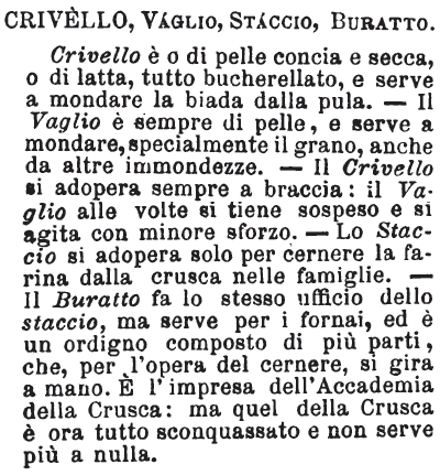 | Crivello, Vaglio, Staccio, Buratto - Crivello è o di pelle concia e secca, o di latta, tutto bucherellato, e serve a mondare la biada dalla pula. - Il Vaglio è sempre di pelle, e serve a mondare, specialmente il grano, anche da altre immondezze. - Il Crivello si adopera sempre a braccia: il Vaglio alle volte si tiene sospeso e si agita con minore sforzo. - Lo Staccio si adopera solo per cernere la farina dalla crusca nelle famiglie. - Il Buratto fa lo stesso ufficio dello staccio, ma serve per il fornai, ed è un ordigno composto di più parti, che, per l'opera del cernere, si gira a mano. E' l'impresa dell'Accademia della Crusca: ma quel della Crusca è ora tutto sconquassato e non serve più a nulla. [immagine] |