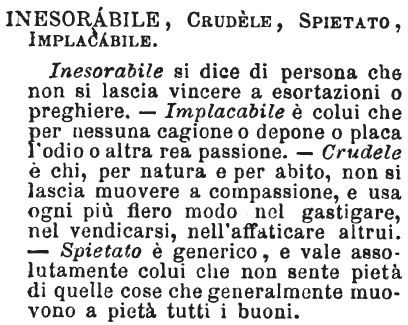 | Inesorabile, Crudele, Spietato, Implacabile - Inesorabile si dice di persona che non si lascia vincere a esortazioni o preghiere. - Implacabile è colui che per nessuna cagione o depone o placa l'odio o altra rea passione. - Crudele è chi, per natura e per abito non si lascia muovere a compassione, e usa ogni più fiero modo nel gastigare, nel vendicarsi, nell'affaticare altrui. - Spietato è generico, e vale assolutamente colui che non sente pietà di quelle cose che generalmente muovono a pietà tutti i buoni. [immagine] |