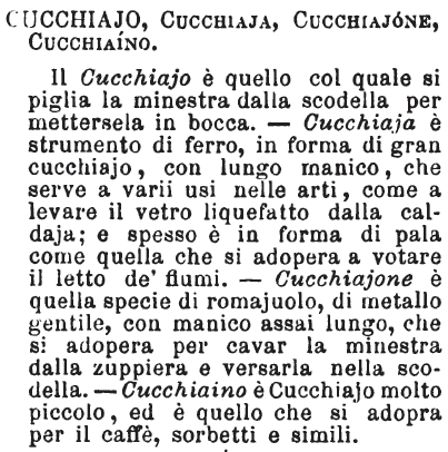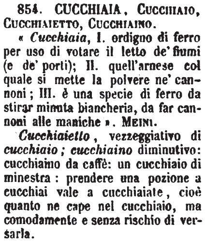 | Cucchiaia, Cucchiaio, Cucchiaietto, Cucchiaino - « Cucchiaia, I. ordigno di ferro per uso di votare il letto de' fiumi (e de' porti); II. quell'arnese col quale si mette la polvere ne' cannoni; III. è una specie di ferro da stirar minuta biancheria, da far cannoni alle maniche ». Meini.