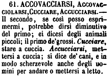 | Usando "cucciare" (*) si possono ottenere i seguenti risultati: fiaccuccia * = fiacre; medicucci * = mediare; stancucci * = stanare; * areole = cucciole; * areolata = cucciolata; * areolate = cucciolate. |