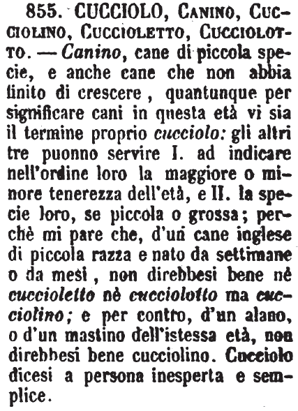 | Cucciolo, Canino, Cucciolino, Cuccioletto, Cucciolotto - Canino, cane di piccola specie, e anche cane che non abbia finito di crescere, quantunque per significare cani in questa età vi sia il termine proprio cucciolo: gli altri tre puonno servire I. ad indicare nell'ordine loro la maggiore o minore tenerezza dell'età, e II. la specie loro, se piccola o grossa; perchè mi pare che, d'un cane inglese di piccola razza e nato da settimane o da mesi, non direbbesi bene nè cuccioletto nè cucciolotto ma cucciolino; e per contro, d'un alano, o d'un mastino dell'istessa età, non direbbesi bene cucciolino. Cucciolo dicesi a persona inesperta e semplice. [immagine] |
