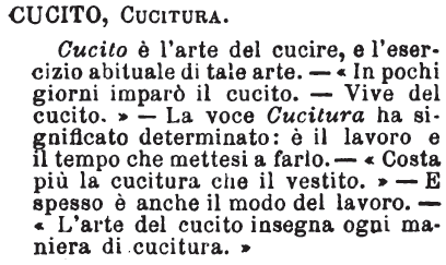 | Cucito, Cucitura - Cucito è l'arte del cucire, e l'esercizio abituale di tale arte. - « In pochi giorni imparò il cucito. - Vive del cucito.» - La voce Cucitura ha significato determinato: è il lavoro e il tempo che mettesi a farlo. - « Costa più la cucitura che il vestito.» - E spesso è anche il modo del lavoro. - « L'arte del cucito insegna ogni maniera di cucitura.» [immagine] |