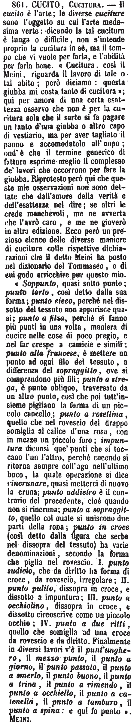 | Cucito, Cucitura - Il cucito è l'arte; le diverse cuciture sono l'oggetto su cui l'arte medesima verte: dicendo la tal cucitura è lunga o difficile, non s'intende proprio la cucitura in sè, ma il tempo che vi vuole per farla, e l'abilità per farla bene. «Cucitura. così il Meini, riguarda il lavoro di tale o tal abito; però diciamo: questa giubba mi costa tanto di cucitura»; qui per amore di una certa esattezza osservo che non è per la cucitura sola che il sarto si fa pagare un tanto d'una giubba o altro capo di vestiario, ma per aver tagliato il panno e accomodatolo all'uopo; ond'è che il termine generico di fattura esprime meglio il complesso de' lavori che occorrono per fare la giubba. Riprotesto però qui che queste mie osservazioni non sono dettate che dall'amore della verità e dell'esattezza nel dire; se altri le crede manchevoli, me ne avverta che l'avrò caro, e me ne gioverò in altra edizione. Ecco però un prezioso elenco delle diverse maniere di cuciture colle rispettive dichiarazioni che il detto Meini ha posto nel dizionario del Tommaseo, e di cui godo arricchire pur questo mio.