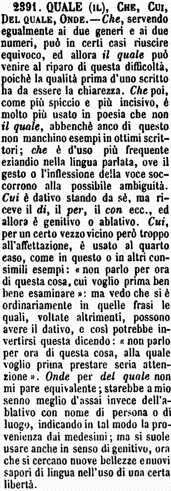 | Quale (il), Che, Cui, Del quale, Onde - Che, servendo egualmente ai due generi e ai due numeri, può in certi casi riuscire equivoco, ed allora il quale può venire al riparo di questa difficoltà, poichè la qualità prima d'uno scritto ha da essere la chiarezza. Che poi, come più spiccio e più incisivo, è molto più usato in poesia che non il quale, abbenchè anco di questo non manchino esempi in ottimi scrittori; che è d'uso più frequente eziandio nella lingua parlata, ove il gesto o l'inflessione della voce soccorrono alla possibile ambiguità. Cui è dativo stando da sè, ma riceve il di, il per, il con ecc., ed allora è genitivo o ablativo. Cui, per un certo vezzo vicino però troppo all'affettazione, è usato al quarto caso, come in questo o in altri consimili esempi: «non parlo per ora di questa cosa, cui voglio prima ben bene esaminare»: ma vedo che si è ordinariamente in quelle frasi le quali, voltate altrimenti, possono avere il dativo, e così potrebbe invertirsi questa dicendo: «non parlo per ora di questa cosa, alla quale voglio prima prestare seria attenzione». Onde per del quale non mi pare equivalente; starebbe a mio senno meglio d'assai invece dell'ablativo con nome di persona o di luogo, indicando in tal modo la provenienza dai medesimi; ma si suole usare anche in senso di genitivo, ora che si cercano nuove bellezze e nuovi sapori di lingua nell'uso di una certa libertà. [immagine] |