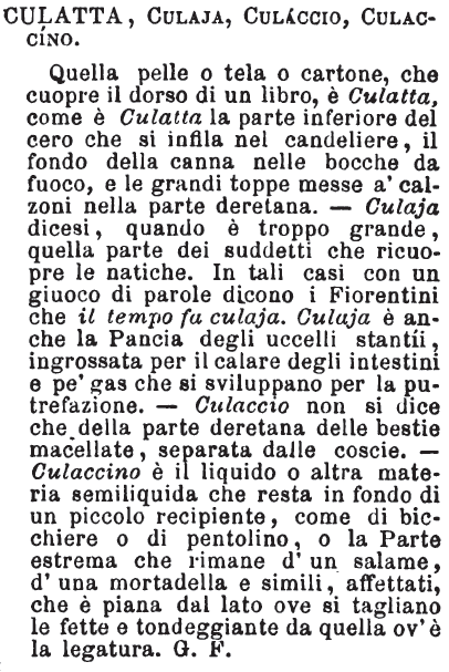 | Culatta, Culaja, Culaccio, Culaccino - Quella pelle o tela o cartone, che cuopre il dorso di un libro, è Culatta, come è Culatta la parte inferiore del cero che si infila nel candeliere, il fondo della canna nelle bocche da fuoco, e le grandi toppe messe a’ calzoni nella parte deretana. - Culaja dicesi, quando è troppo grande, quella parte dei suddetti che ricuopre le natiche. In tali casi con un giuoco di parole dicono i Fiorentini che il tempo fa culaja. Culaja è anche la Pancia degli uccelli stantíi, ingrossata per il calare degli intestini e pe’ gas che si sviluppano per la putrefazione. - Culaccio non si dice che della parte deretana delle bestie macellate, separata dalle coscie. - Culaccino è il liquido o altra materia semiliquida che resta in fondo di un piccolo recipiente, come di bicchiere o di pentolino, o la Parte estrema che rimane d’un salame, d’una mortadella e simili, affettati, che è piana dal lato ove si tagliano le fette e tondeggiante da quella ov’è la legatura. G. F. [immagine] |