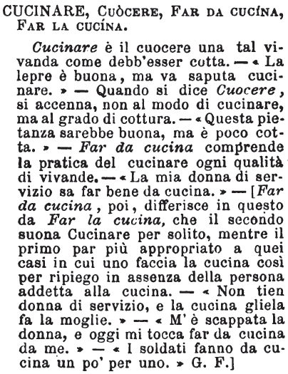 | Cucinare, Far da cucina, Cuocere, Far cuocere - Per dire: so far da cucina, bisogna saper cucinare un certo numero di piatti; perchè il saperne cucinare, cioè preparare e far cuocere secondo le regole culinarie, uno o due, non basta: cuocere dicesi, ma secondo me non tanto propriamente per far cuocere; ma io direi di preferenza sempre questo che non quello, poichè è la pietanza che cuoce; e se vuolsi fare attivo il verbo, è il fuoco allora che attiva la cottura; ma il cuciniere fa cuocere, perchè mette sul fuoco e ritira la pietanza appunto quando è cotta, altrimenti per eccesso di cottura andrebbe a male. [immagine] |