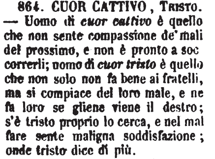 | Cuor cattivo, Tristo - Uomo di cuor cattivo è quello che non sente compassione de' mali del prossimo, e non è pronto a soccorrerli; uomo di cuor tristo è quello che non solo non fa bene ai fratelli, ma si compiace del loro male, e ne fa loro se gliene viene il destro; s'è tristo proprio lo cerca, e nel mal fare sente maligna soddisfazione; onde tristo dice di più. [immagine] |