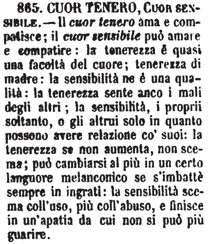 | Cuor tenero, Cuor sensibile - Il cuor tenero ama e compatisce; il cuor sensibile può amare e compatire: la tenerezza è quasi una facoltà del cuore; tenerezza di madre: la sensibilità ne è una qualità: la tenerezza sente anco i mali degli altri; la sensibilità, i proprii soltanto, o gli altrui solo in quanto possono avere relazione co' suoi: la tenerezza se non aumenta, non scema; può cambiarsi al più in un certo languore melanconico se s'imbattè sempre in ingrati: la sensibilità scema coll'uso, più coll'abuso, e finisce in un'apatia da cui non si può più guarire. [immagine] |