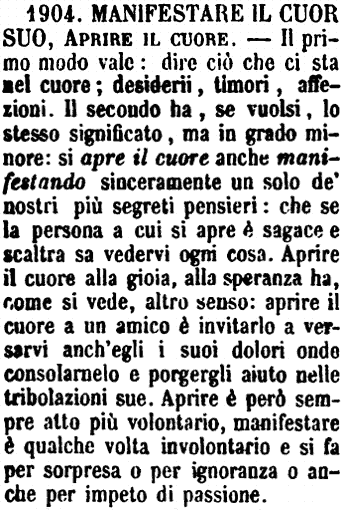 | Manifestare il cuore suo, Aprire il cuore - Il primo modo vale: dire ciò che ci sta nel cuore; desiderii, timori, affezioni. Il secondo ha, se vuolsi, lo stesso significato, ma in grado minore: si apre il cuore anche manifestando sinceramente un solo de' nostri più segreti pensieri: che se la persona a cui si apre è sagace e scaltra sa vedervi ogni cosa. Aprire il cuore alla gioia, alla speranza ha, come si vede, altro senso: aprire il cuore a un amico è invitarlo a versarvi anch'egli i suoi dolori onde consolarnelo e porgergli aiuto nelle tribolazioni sue. Aprire è però sempre atto più volontario, manifestare è qualche volta involontario e si fa per sorpresa o per ignoranza o anche per impeto di passione. [immagine] |