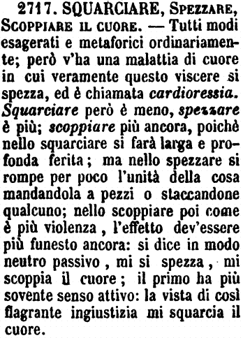 | Squarciare, Spezzare, Scoppiare il cuore - Tutti modi esagerati e metaforici ordinariamente; però v'ha una malattia di cuore in cui veramente questo viscere si spezza, ed è chiamata cardioressia. Squarciare però è meno, spezzare è più; scoppiare più ancora, poichè nello squarciare si farà larga e profonda ferita; ma nello spezzare si rompe per poco l'unità della cosa mandandola a pezzi o staccandone qualcuno; nello scoppiare poi come è più violenza, l'effetto dev'essere più funesto ancora: si dice in modo neutro passivo, mi si spezza, mi scoppia il cuore; il primo ha più sovente senso attivo: la vista di così flagrante ingiustizia mi squarcia il cuore. [immagine] |