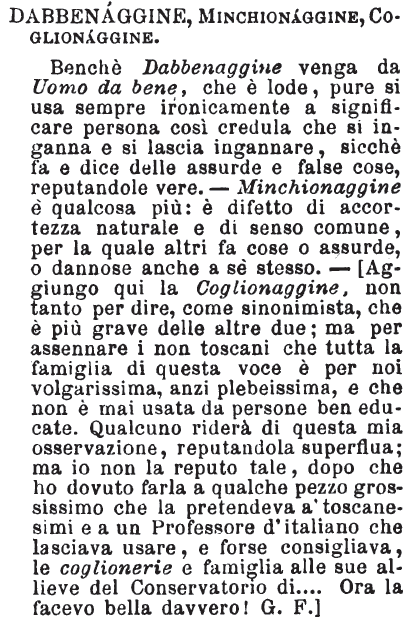 | Dabbenaggine, Minchionaggine, Coglionaggine - Benchè Dabbenaggine venga da Uomo da bene, che è lode, pure si usa sempre ironicamente a significare persona così credula che si inganna e si lascia ingannare, sicchè fa e dice delle assurde e false cose, reputandole vere. - Minchionaggine è qualcosa di più: è difetto di accortezza naturale e di senso comune, per la quale altri fa cose o assurde o dannose anche a sè stesso. - [Aggiungo qui la Coglionaggine, non tanto per dire, come sinonimista, che è più grave delle altre due; ma per assennare i non toscani che tutta la famiglia di questa voce è per noi volgarissima, anzi plebeissima, e che non è mai usata da persone ben educate. Qualcuno riderà di questa mia osservazione, reputandola superflua; ma io non la reputo tale, dopo che ho dovuto farla a qualche pezzo grossissimo che la pretendeva a' toscanesimi e a un Professore d'italiano che lasciava usare, e forse consigliava, le coglionerie e famiglia alle sue allieve del Conservatorio di.... Ora la facevo bella davvero! G. F.] [immagine] |