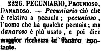 | Pecuniario, Pecunioso, Danaroso - Pecuniario ciò che è relativo a pecunia; pecunioso, l'uomo che ha qualche pecunia; ma danaroso è più usato, e poi dice maggior ricchezza in danaro contante. [immagine] |