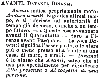 | Davanti, Dinanzi, Innanzi, Avanti, Oltre - « Davanti e dinanzi ora più comunemente dicesi del luogo: innanzi e avanti e del luogo e del tempo. Innanzi e avanti vagliono pure oltre, sopra, piuttosto: bensì non proprii degli altri due ». Bembo e Cioni.