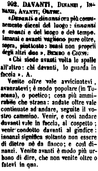 « Chi siede avanti volta le spalle all'altro: chi davanti, lo guarda in faccia ». A. Venite oltre vale avvicinatevi, avanzatevi; è modo popolare (in Toscana), o poetico; cosa più ammirabile che strana: andate oltre vale continuate ad andare, seguite il vostro cammino. Venir, e così andare davanti vale in faccia, al cospetto; venir condotto davanti al giudice: innanzi significa soltanto non essere di dietro nè da fianco; e così dinanzi. Venite avanti è modo più urbano di dire, che non venite oltre o fatevi in qua. [immagine] |