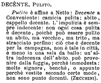 | Decente, Pulito - Pulito è affine a Netto: Decente a Conveniente: camicia pulita; abito, cappello decente. L'impulizia è sempre indecente: non ogni cosa pulita è decente, poichè può essere pulito un abito, ma vecchio, ma trito, ma stracciato perfino: ciò che è decente per la campagna, non è tale in città, e meno in una sala da ballo: un'altra indecenza dell'abito, può provenire dalla foggia, perchè immodesta: molte signore, benchè, o appunto perchè vestite secondo certe mode, non sono punto decenti. (Zecchini). [immagine] |