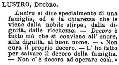 | Lustro, Decoro - Lustro si dice specialmente di una famiglia, ed è la chiarezza che le viene dalla nobile stirpe, dalla dignità, dalle ricchezze. - Decoro è tutto ciò che si conviene all'onore, alla dignità, al buon nome. - « Non cura il prorpio decoro. - L'ho fatto per salvare il decoro della famiglia. - Non c'è decoro ad operare così. » [immagine] |