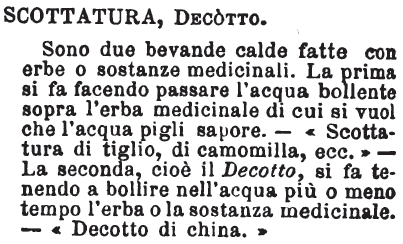 | Scottatura, Decotto - Sono due bevande calde fatte con erbe o sostanze medicinali. La prima si fa facendo passare l'acqua bollente sopra l'erba medicinale di cui si vuol che l'acqua pigli sapore. - «Scottatura di tiglio, di camomilla, ecc.» - La seconda, cioè il Decotto, si fa tenendo a bollire nell'acqua più o meno tempo l'erba o la sostanza medicinale. - «Decotto di china.» [immagine] |