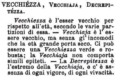 | Vecchiezza, Vecchiaja, Decrepitezza - Vecchiezza è l'esser vecchio per rispetto all'età, secondo le varie partizioni di essa. - Vecchiaja è l'essere vecchio, ma senza gl'incomodi che la età grande porta seco. Ci può essere una Vecchiezza verde e robusta; la Vecchiaja non comporta simili epiteti. - La Decrepitezza è l'estremo della Vecchiaja, e c'è assenza di ogni vigore, di ogni vivacità. [immagine] |