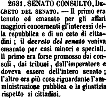 | Senato Consulto, Decreto del senato - Il primo era tenuto ed emanato per gli affari maggiori concernenti gl'interessi della repubblica e di un ceto di cittadini; il decreto del senato veniva emanato per casi minori e speciali. Il primo era forse promosso dai consoli, dai tribuni, dall'imperatore e doveva essere dell'intero senato; l'altro era più cosa riguardante l'amministrazione pubblica o la giustizia rispetto ai cittadini. [immagine] |