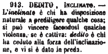 | Dedito, Inclinato - L'inclinato è chi ha disposizione naturale a prediligere qualche cosa; si può vincere facendosi qualche violenza, se è cattiva: dedito è chi ha ceduto alla forza dell'inclinazione, e vi si è dato in preda. [immagine] |