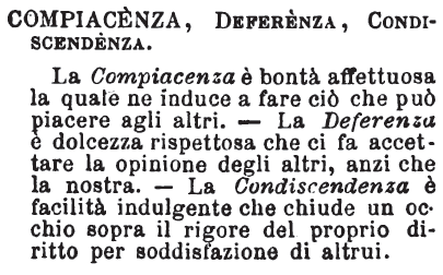| Compiacenza, Deferenza, Condiscendenza - La Compiacenza è bontà affettuosa la quale ne induce a fare ciò che può piacere agli altri. - La Deferenza è dolcezza rispettosa che ci fa accettare la opinione degli altri, anzi che la nostra. - La Condiscendenza è facilità indulgente che chiude un occhio sopra il rigore del proprio diritto per soddisfazione di altrui. [immagine] |