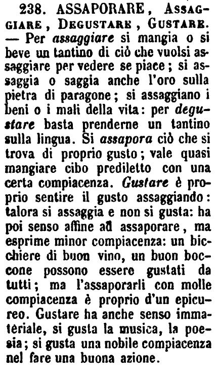 | Assaporare, Assaggiare, Degustare, Gustare - Per assaggiare si mangia o si beve un tantino di ciò che vuolsi assaggiare per vedere se piace; si assaggia o saggia anche l'oro sulla pietra di paragone; si assaggiano i beni o i mali della vita: per degustare basta prenderne un tantino sulla lingua. Si assapora ciò che si trova di proprio gusto; vale quasi mangiare cibo prediletto con una certa compiacenza. Gustare è proprio sentire il gusto assaggiando: talora si assaggia e non si gusta: ha poi senso affine ad assaporare, ma esprime minor compiacenza: un bicchiere di buon vino, un buon boccone possono essere gustati da tutti; ma l'assaporarli con molle compiacenza è proprio d'un epicureo. Gustare ha anche senso immateriale, si gusta la musica, la poesia; si gusta una nobile compiacenza nel fare una buona azione. [immagine] |