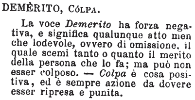 | Demerito, Colpa - La voce Demerito ha forza negativa, e significa qualunque atto men che lodevole, ovvero di omissione, il quale scemi tanto o quanto il merito della persona che lo fa; ma può non esser colposo. - Colpa è cosa positiva, ed è sempre azione da dovere esser ripresa e punita. [immagine] |